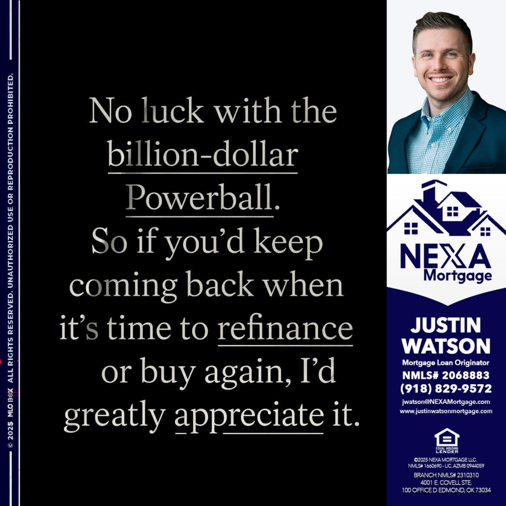 NO LUCK WITH - Justin Watson -Mortgage Loan OriginatorHi, my name is Justin Watson. I’m a Loan Officer with NEXA Mortgage LLC., offering personalized mortgage solutions, fast customized quotes, great rates and service with integrity.